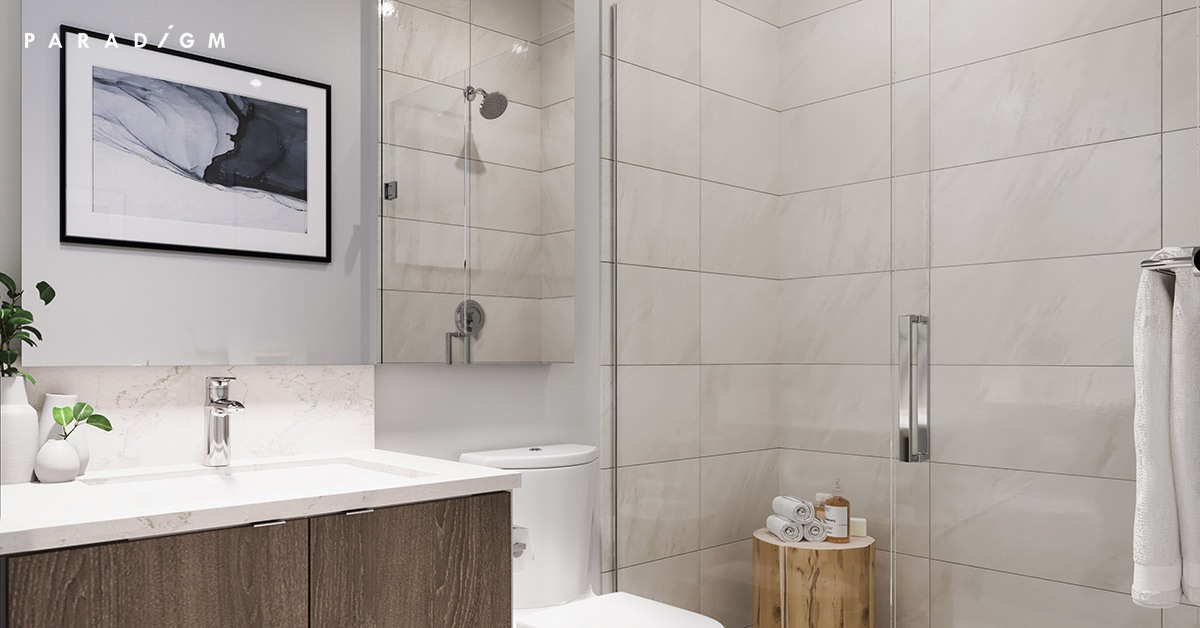 Envisioned by DIALOG, Paradigm takes cues from River District’s industrial past and surrounding nature. The building’s exterior is characterized by a two-tone façade and glass balconies, while strong vertical lines draw the eye skyward. At ground level, there’s a collection of three-storey townhomes with modern lines, rooftop terraces and a light colour palette that matches the tower. The tower and townhomes are arranged around a large, landscaped courtyard with mature trees, landscaped gardens, children’s play areas and plenty of seating.