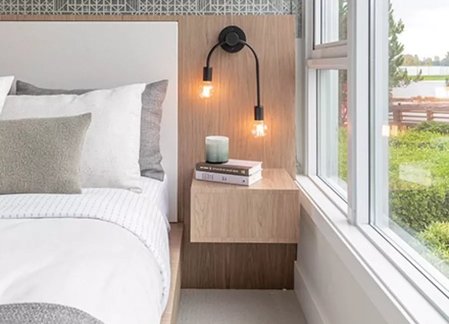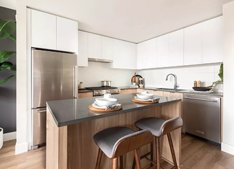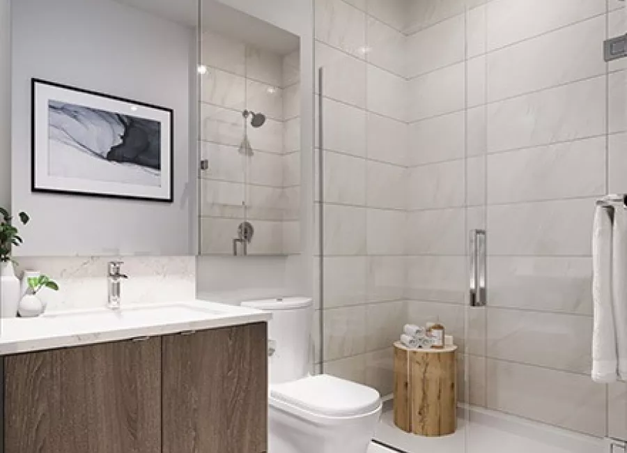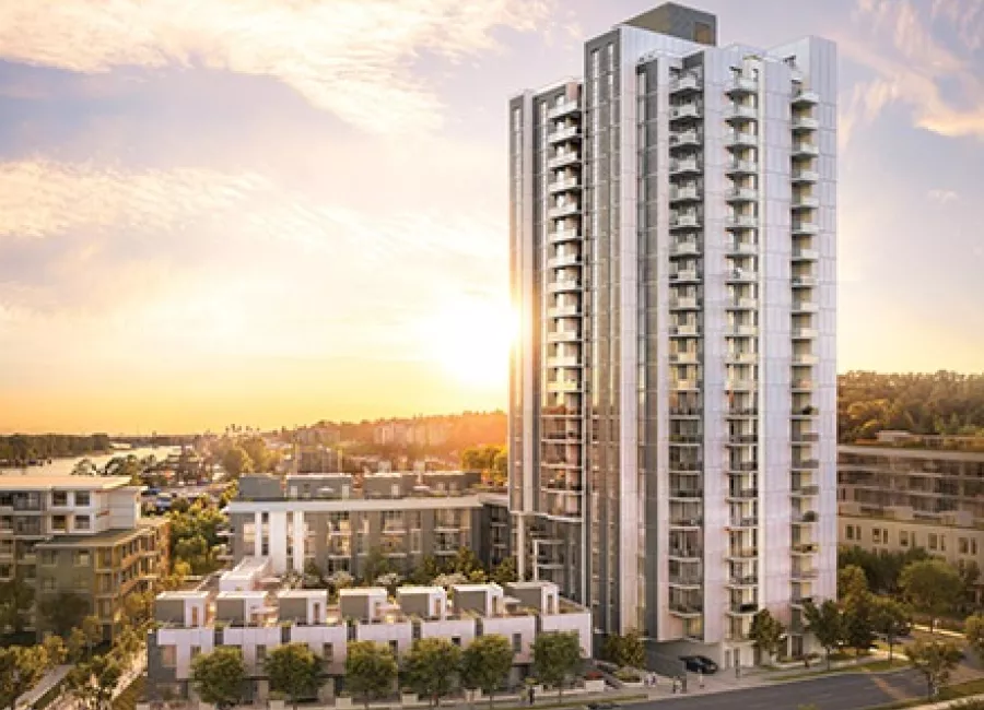 A collection of 286 condo and townhouse suites located along East Kent Avenue South. This 22-storey tower will be a part of the master-planned community, River District.